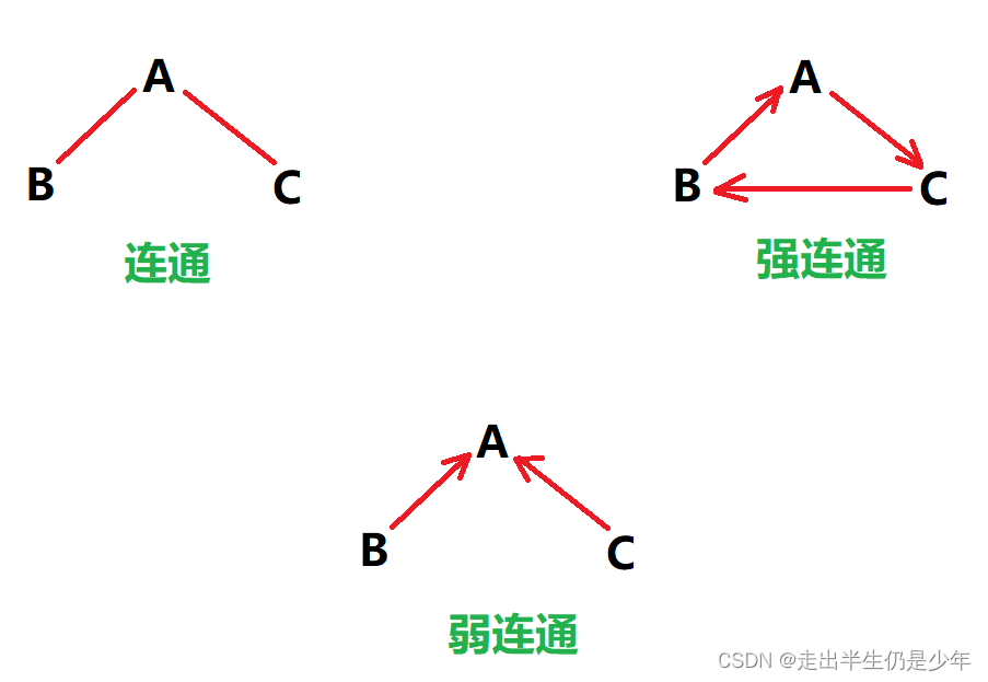 目录一、什么是强连通分量1. 概念2. 强连通分量二、两种dfs遍历1. 方式12. 方式2三、一个简单例子理解算法四、更完整的一个例子五、Code实现一、什么是强连通分量tarjan强连通分量算法1. 概念连通:无向图中,从任意点i可到达任一点j强连通:有向图中,从任意点i可到达任一点j弱连通:把有向图看作无向图时,从任意点i可到达任一点j如图,强连通无论那个点,都能按照方向到达任意一点,弱连通