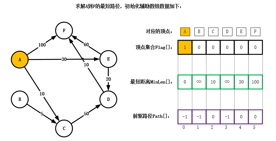 设置一个集合S存放已经找到最短路径的顶点,并设置一个源点,dist[]数组中存放源点距离每个顶点的最短距离,path[]数组中存放的是最短路径,基本过程可以如下描述:(下图来自懒猫老师的《数据结构》相关课程笔记)每个分量distfl表示当前所找到的从始点v到终点»的最短路径的长度。path[i]是一个字符串,表示当前所找到的从始点v到终点vi的最短路径。初态为:若从V有弧,则path[i]为0:否