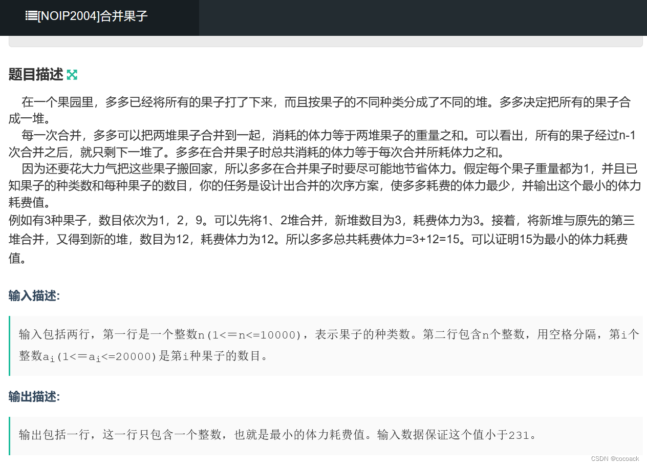这个题跟上一个有异曲同工之妙,我们可以用3个队列来维护最大长度(用优先队列会超),同时,有个十分巧妙地点,对于某个过程产生的蚯蚓,我们让他们-前面时间增加的长度,这样统一了基准,巧妙地把某个过程产生的蚯蚓化为一开始就产生的。下面为分析:显然,我们要先合并最小的两堆(因为他们在后边也得被计算,换句话,我们独立的看,某一堆的体力值为他自己重量*从现在到最后的次数)因此,我们可以用两个队列来做。下面我用