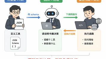 Function Calling 我的理解是这样一套机制:开发者用 JSON schema 把工具描述好传给模型,模型判断需要调工具的时候不输出自然语言,而是直接输出一段结构化的 tool_calls JSON,告诉你「我要调哪个函数、参数是什么」,你的代码拿到这段 JSON 去真正执行,把结果塞回对话,模型再生成最终答案。整个流程本质上是两轮对话:第一轮模型说「我需要调这个工具」,你去执行,第二