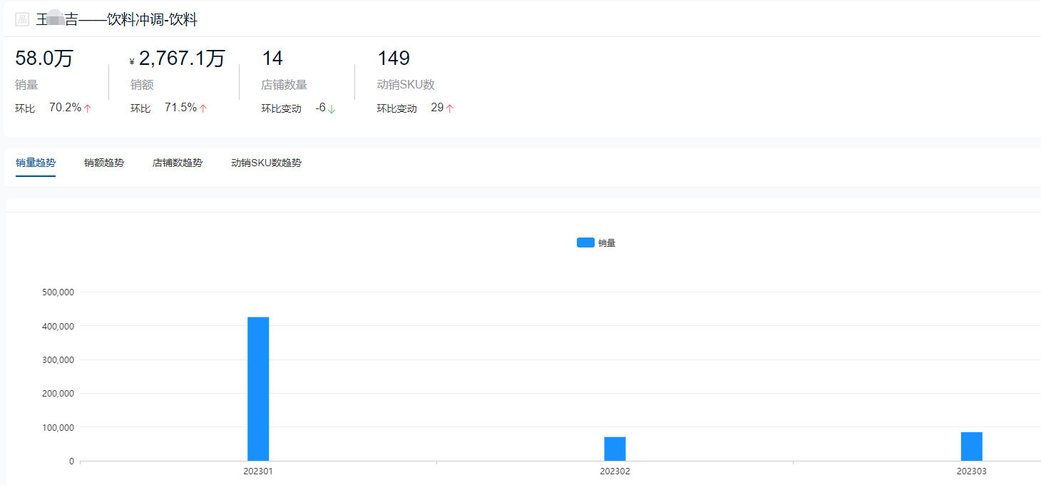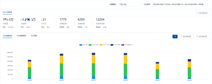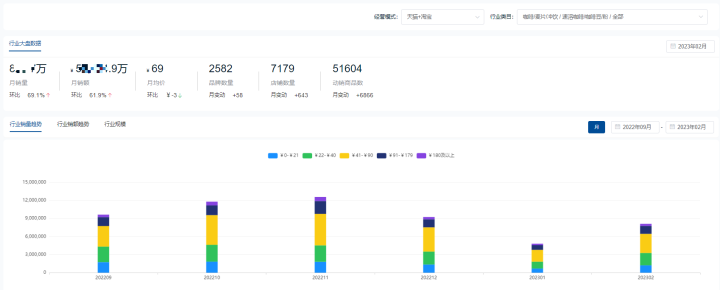 根据鲸参谋电商数据显示,2023年2月份在天猫平台上,咖啡产品的月销量超过820万件,环比增长了将近70%;月销额超过5.6亿元,环比增长了约62%。
