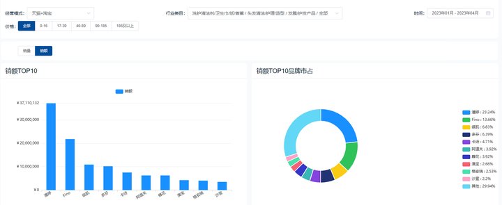 截至4月份,海飞丝品牌的销额为1.3亿+,市占约为12%;当前,相较于洗发水来说,发膜市场的集中度还是比较高的,CR10占比约为70%,包括潘婷、Fino、缤肌、多芬、卡诗、阿道夫、蜂花、澳宝、格安瑞和沙宣这10个品牌。从热销商品榜单中可以看出,潘婷品牌的多款商品都上榜了热销商品TOP10的榜单,如潘婷的“奢护多效损伤修护”发膜,1月至4月累计销量超过17万,销售额近690万。根据鲸参谋电商数据分