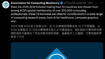 2025 ACM Fellow公布!全球71位计算机顶尖学者当选,顶尖1%的荣誉。19位华人学者上榜,其中包括清华朱军、北大陈宝权、港科大贾佳亚、熊辉。2025 ACM Fellow名单,正式出炉!今天,全球最具影响力计算学会ACM官宣:2025年新增71位Fellow。新晋入选者中,华人学者占19席(占比约27%),有我们熟知的AI大佬,比如北大陈宝权、清华朱军、港科大贾佳亚、熊辉等。要知道,全