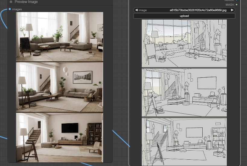 这个工作流的名字已经道出了它的核心功能:帮助设计师为室内设计线稿图进行自动上色处理。只需简单几步操作,就能实现专业的色彩效果,省去繁琐的人工上色过程。这套工作流将线稿图作为输入,通过一系列图像处理节点——包括去背景、自动上色和背景移除等——最终呈现出一张色彩丰富的成品。