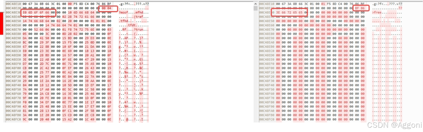 使用自己研究的方法,在不用ffmpeg重新解封装的情况下,将其中的一个片段抹去,并且可以在vlc播放器上自动跳过删除的部分。要在vlc播放还是需要保持删除的片段大于60s,这是vlc播放器里面写死的,详细可以看ts删除的那篇,里面有详细说明。需要把moof的type修改成free, 同时把size修改成 moof+mdat的大小。可以把其中一个moof+mdat全部置0。然后把剩下的数据全部置0。