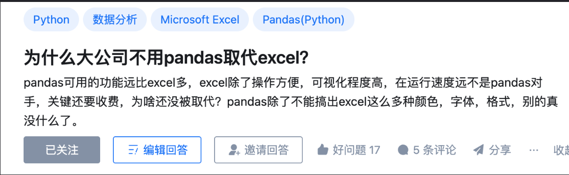 pandas 是基于NumPy 的一种工具, 名字很卡哇伊,来源是由“ Panel data”(面板数据,一个计量经济学名词)两个单词拼成的。pandas纳入了大量库和一些标准的数据模型,提供了高效地操作大型数据集所需的工具。主要应用于处理大型数据集。数据处理速度算是最大的特色,剩下的就是个python版的excel了吧。API文档:http://pandas.pydata.org/panda..