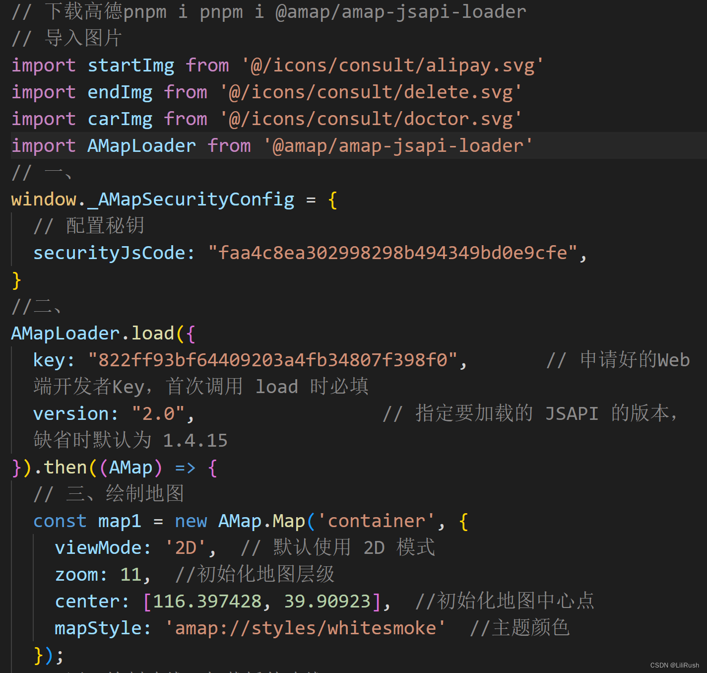注册&认证个人开发者===>创建web应用====>得到。配置安全密钥 securityJsCode。在vue3项目中使用。