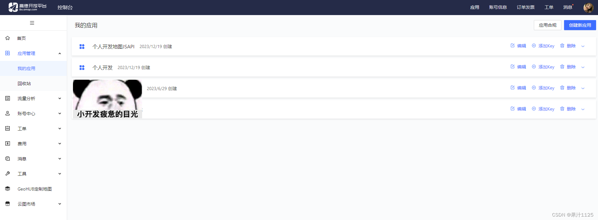 高德开放平台|高德开放平台官网|高德开放平台控制台|官网控制台|控制台|应用管理|应用分析|账号信息|开发者信息|账号权限|KEY管理。创建 div 标签作为地图容器 ,并设置地图容器的 id 属性为 container(属性自定义),并设置固定的宽高。4.vue2和vue3声明map对象方式不一样 ----> 请参考官网,我使用的是vue3。创建的新应用须根据实际情况选择应用类型。我这里选择的是
