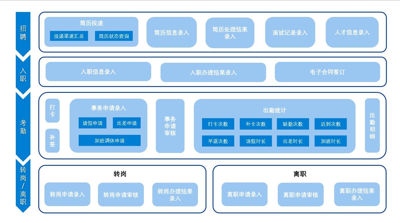 以上这副图是一个全面的人力资源信息管理平台的架构,分为五个主要模块:招聘、入职、考勤、转岗/离职,涵盖了员工从招聘到离职的整个生命周期的管理流程。这个架构设计旨在通过信息化手段提高人力资源管理的效率和准确性,确保企业能够高效地进行人才管理和运营。