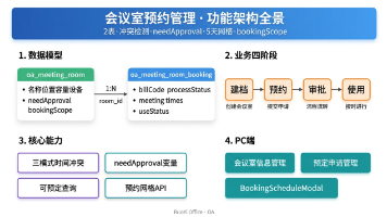 度拆解企业会议室预约管理的完整设计方案。2张表(会议室信息+预定申请单)支撑从会议室建档到预约、审批、使用的全流程,3模式时间冲突检测杜绝"到了才发现被占",needApproval流程变量实现按会议室独立控制审批,5天×30分钟可视化预约网格让空闲时段一目了然,bookingScope可预定范围控制实现会议室级别的访问权限管理。