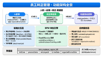 深度拆解企业员工转正管理的完整设计方案。1张转正申请单承载从试用到正式的状态跃迁,BPM审批通过自动更新员工档案状态为正式员工并回写转正日期,员工选择器仅展示非正式状态人员防止重复转正,与入职单形成完整的入职→试用→转正数据链。从业务建模到审批驱动的档案联动,还原一套"审批即转正"的企业人力资源管理方案。