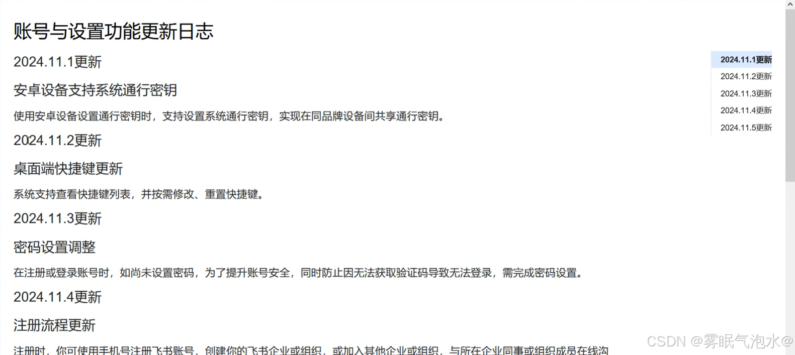 id: 0,title: '2024.11.1更新',name: '安卓设备支持系统通行密钥',content: '使用安卓设备设置通行密钥时,支持设置系统通行密钥,实现在同品牌设备间共享通行密钥。',},id: 1,title: '2024.11.2更新',name: '桌面端快捷键更新',content: '系统支持查看快捷键列表,并按需修改、重置快捷键。',},id: 2,title: '2