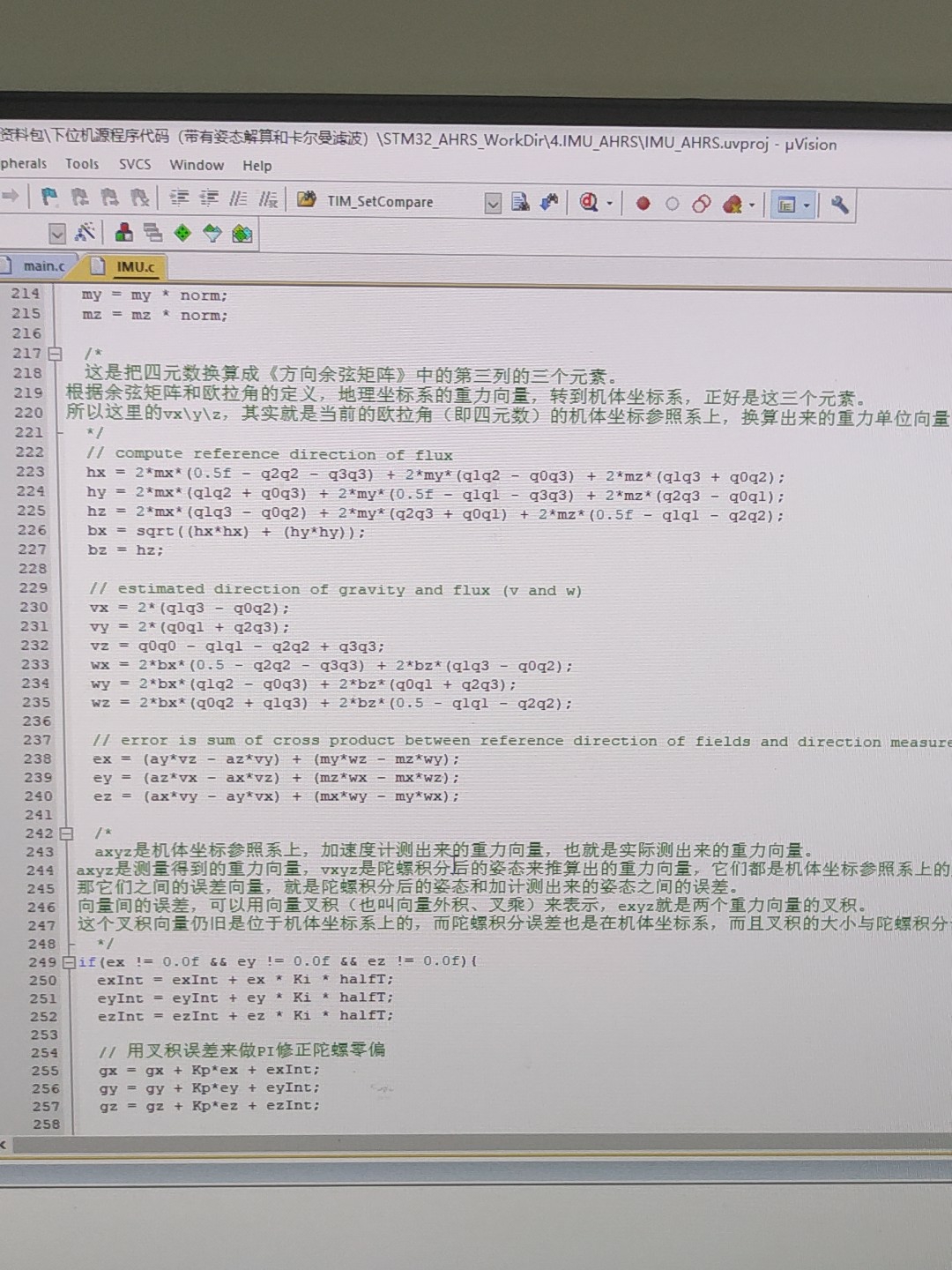 当然还有很多坑没唠,比如磁力计的硬铁补偿和软铁补偿,当年我没做这个的时候,放在桌子边靠近电脑的地方,航向角就会飘,后来加了校准代码才好。前阵子蹲在宿舍焊飞控的时候,突然发现之前抄的九轴解算代码总飘,哪怕把飞控放在桌子上不动,航向角也能自己转个360度,折腾了半天才搞明白是磁力计和气压计没对齐的锅。当时就是这么个代码,跑起来俯仰和滚转还行,但航向角飘得离谱,后来才知道要把hmc5883l的磁力计数据