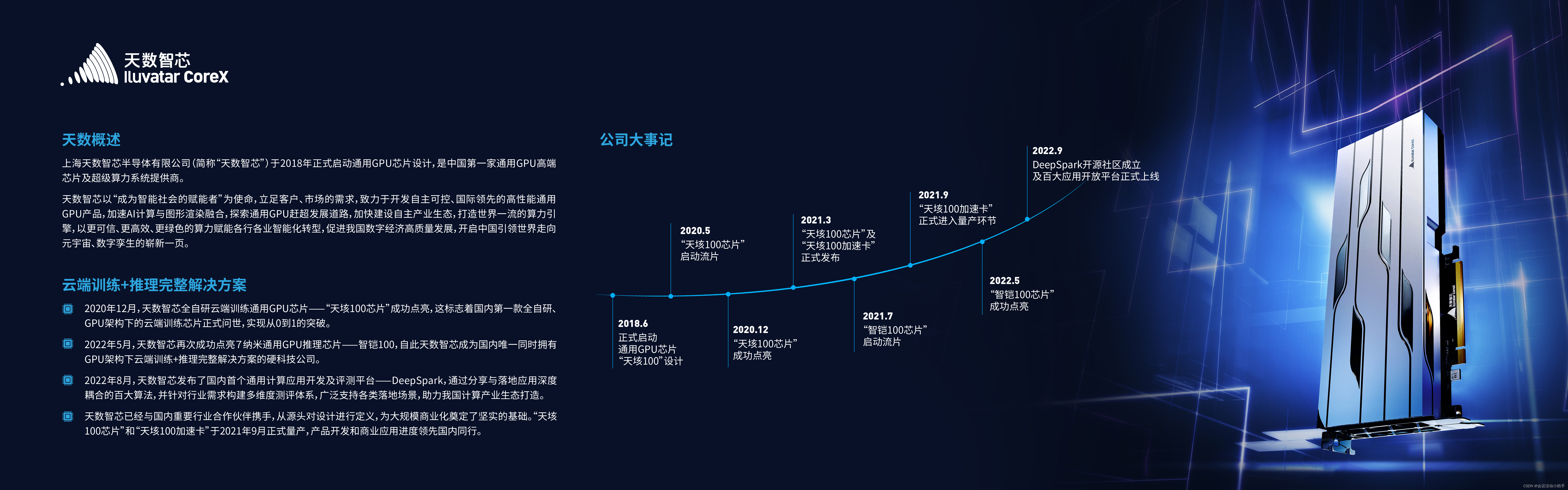 公司以“成为智能社会的赋能者”为使命,致力于开发云端服务器级的通用高性能计算芯片,以客户、市场为导向,瞄准以云计算、人工智能、数字化转型为代表的数据驱动技术市场,解决核心算力瓶颈问题,为全产业打造高端算力解决方案。天数智芯立足国内市场,重点打造自主可控、国际领先的通用、标准、高性能通用并行 GPU 云端计算芯片,从芯片端解决算力问题;上海天数智芯半导体有限公司(简称“天数智芯”)于 2018 年正