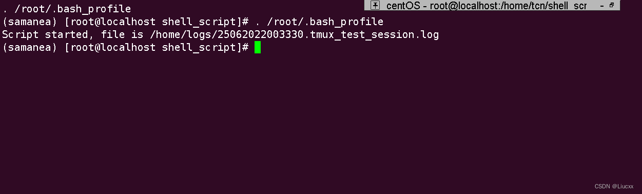 1.为什么需要自动保存日志(1)运行tmux的时候,向上查看日志比较麻烦,要执行ctrl b + [ 的操作,并且查看的日志范围有限(2)如果在tmux窗口内,每次手动使用script命令保存日志,又太麻烦2. 原理•使用linux中的script命令,可以实现将会话信息保存到指定文件中,使用方法:(如果没有这个命令,需要安装一下)script -f a.log将当前会话打印信息输出到a.log文