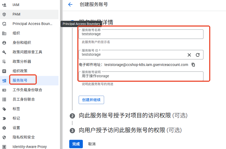 2.点击创建并继续,为账号授权,选择Storage Admin,熟悉之后可以选择其他的。5.密钥创建并下载.json文件后,我们使用这个密钥操作storage。注意国内不能执行,要么执行时设置代理,要么程序放到海外服务器上执行。使用下面代码上传文件到bucket上,主体替换函数的参数值,第四个参数是上一个步骤我们下载的api密钥json文件。3.点击完成后,这个界面我们不选择,直接完成即可。4.在