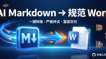 摘要:本文介绍了一款解决AI生成Markdown转Word格式问题的工具"MD to Word Converter"。它能将Markdown语义结构精准映射为Word样式体系,确保标题层级、字体字号、段落属性等符合中文公文标准(GB/T 9704-2012)。工具提供双模式操作:交互式可自定义样式,静默式适合批量处理。通过结构化中间层转换,实现"AI生成→规范Word→直接交付"的完整工作流,显著
