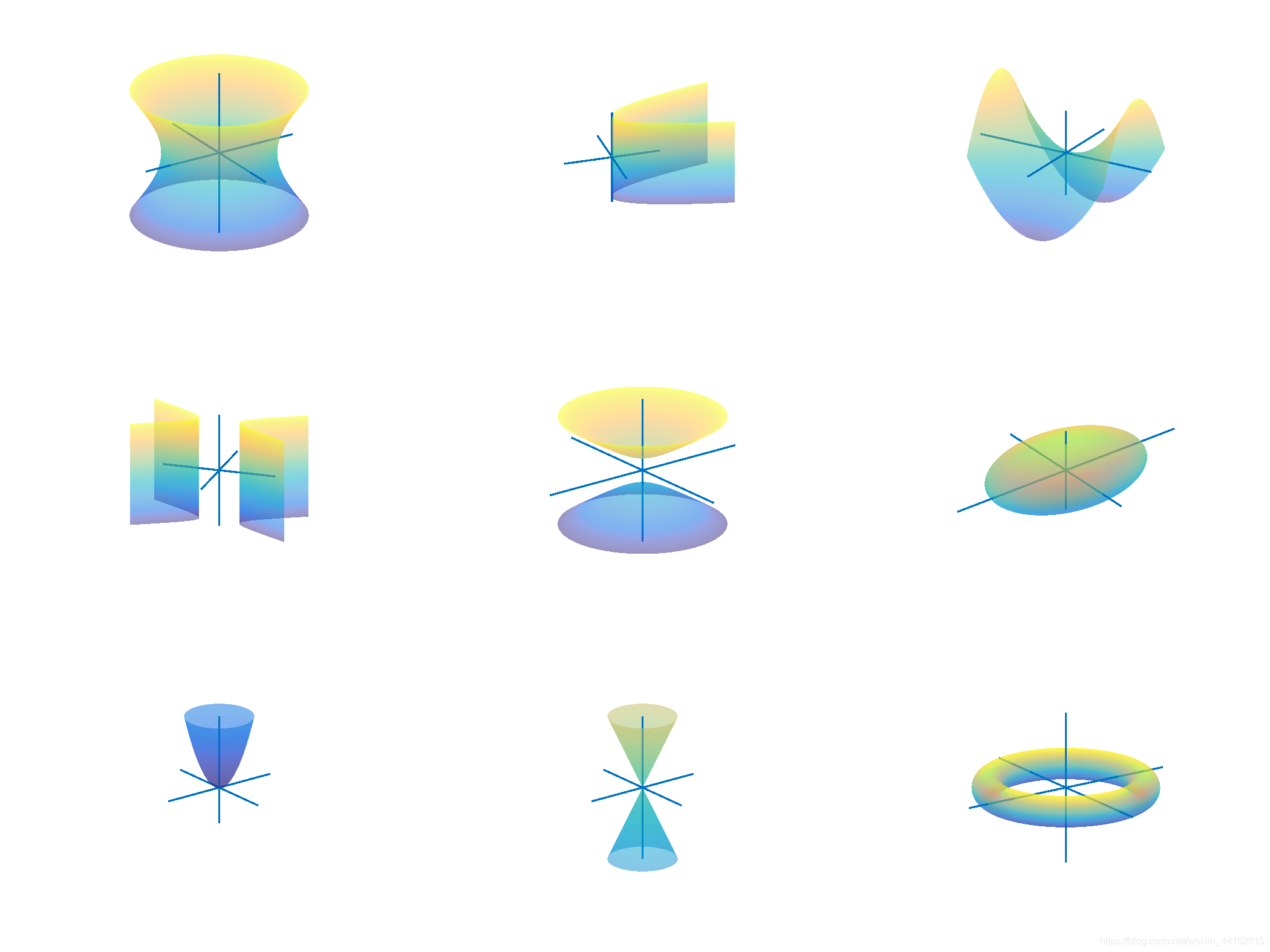 十种常用二次曲面及其matlab绘制1.椭球面若a=b=c,则为球面参数方程:2.椭圆锥面若a=b,则为圆锥面参数方程:3.单页双曲面参数方程:4.双叶双曲面参数方程:5.椭圆抛物面参数方程:6.双曲抛物面参数方程:7.椭圆柱面参数方程:8.双曲柱面参数方程:9.抛物柱面参数方程:10.圆环面参数方程:代码详见:https://zhuanlan.zhihu.com/p/393899409...