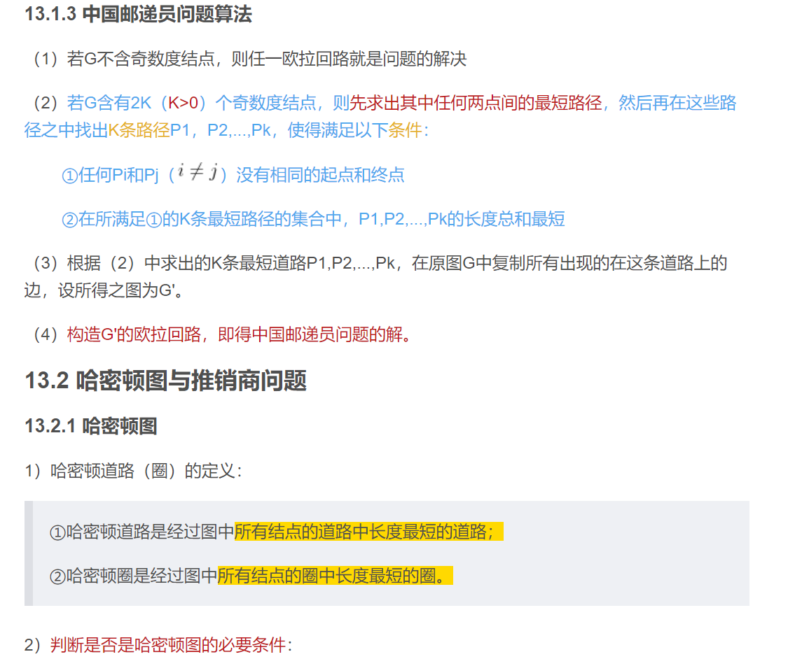 13.1 欧拉图与中国邮递员问题13.1.1 欧拉图基本知识点1)欧拉道路(回路)的定义:设G是一个无孤立结点的图,包含G的每条边的回路一条欧拉道路(回路)是经过图中每边一次仅一次的道路(回路)2)如何判别欧拉图:具有欧拉回路的图3)一个图含有欧拉道路的条件:①非平凡连通图G=<V,E>含有欧拉道路当且仅当G仅有零个或两个奇数度结点②无向连通图G=<V,E>是欧拉图当且仅当