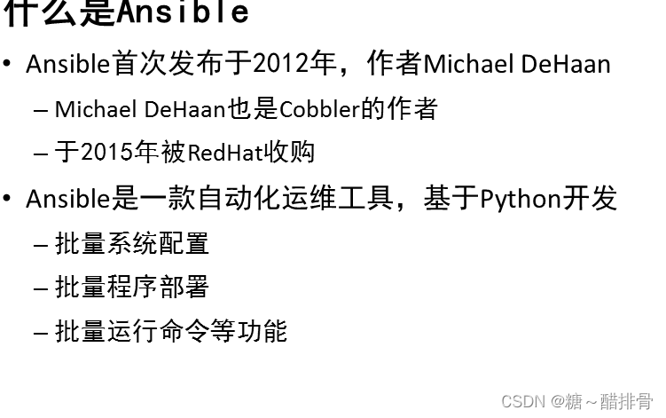 批量执行远程命令,可以对远程的多台主机同时进行命令的执行。批量安装和配置软件服务,可以对远程的多台主机进行自动化的方式配置和管理各种服务。编排高级的企业级复杂的IT架构任务, Ansible的Playbook和role可以轻松实现大型的IT复杂架构。提供自动化运维工具的开发API, 有很多运维工具,如jumpserver(堡垒机)就是基于 ansible 实现自动化管理功能。