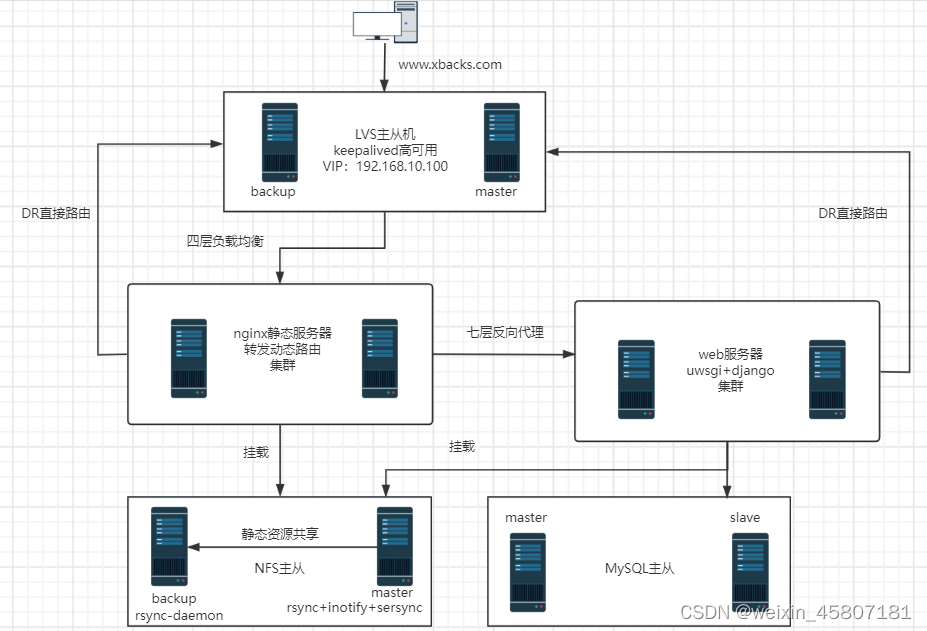 Linux企业运维——LVS负载均衡(临时笔记,以后会详细修补)文章目录Linux企业运维——LVS负载均衡1、LVS简介2、DR模式3、使用DR模式实现负载均衡4、问题解决5、LVS的10个调度算法简介1、LVS简介LVS(Linux Virtual Server)即Linux虚拟服务器,是一个虚拟的服务器集群系统,可以在unix/linux平台下实现负载均衡集群功能。LVS是一种集群(Clus
