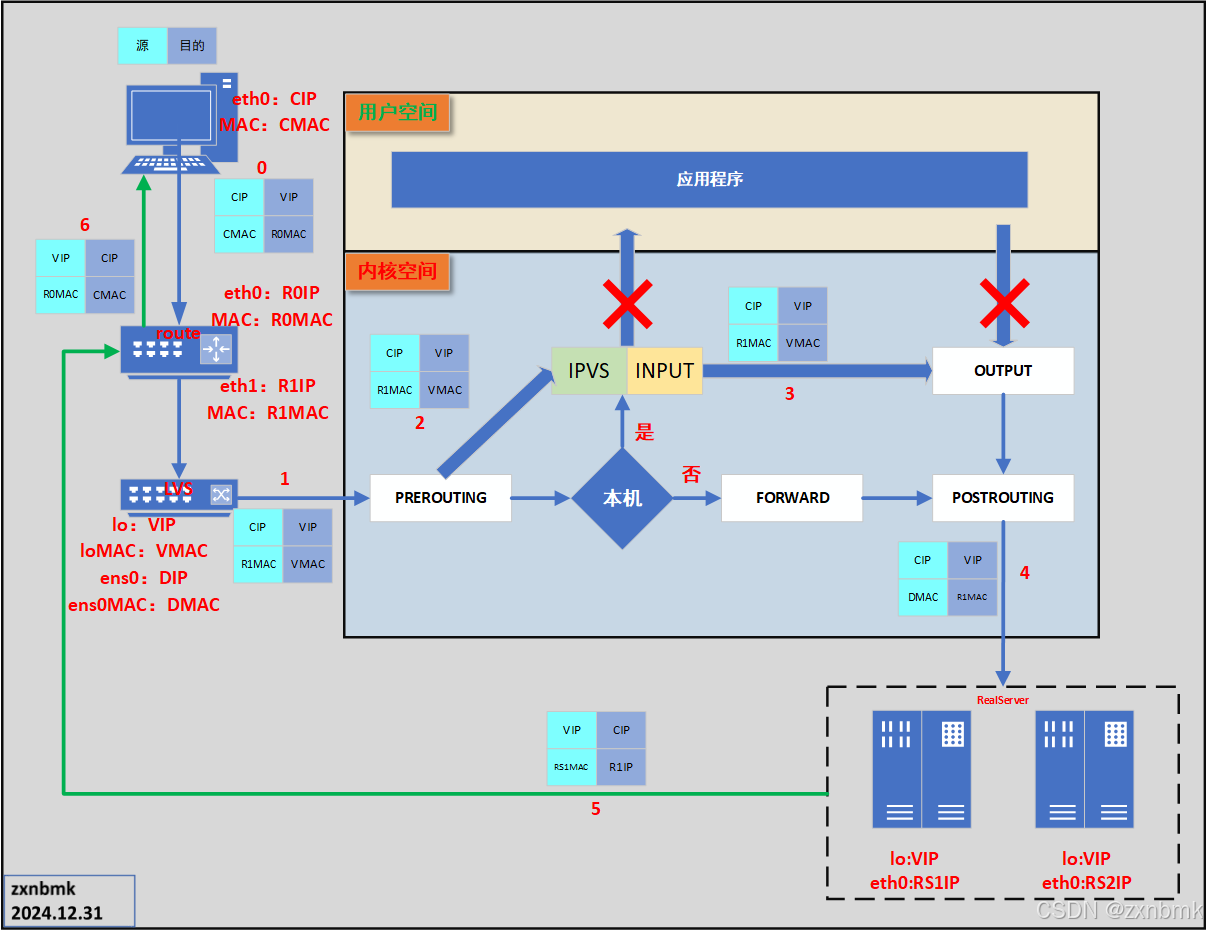 客户端请求发送到负载均衡器(LVS)。LVS 修改请求的目标 IP 地址为后端服务器的 IP 地址,并将请求转发。后端服务器处理请求后,将响应返回给 LVS。LVS 再将响应的源 IP 地址修改为自己的 IP 地址,返回给客户端。