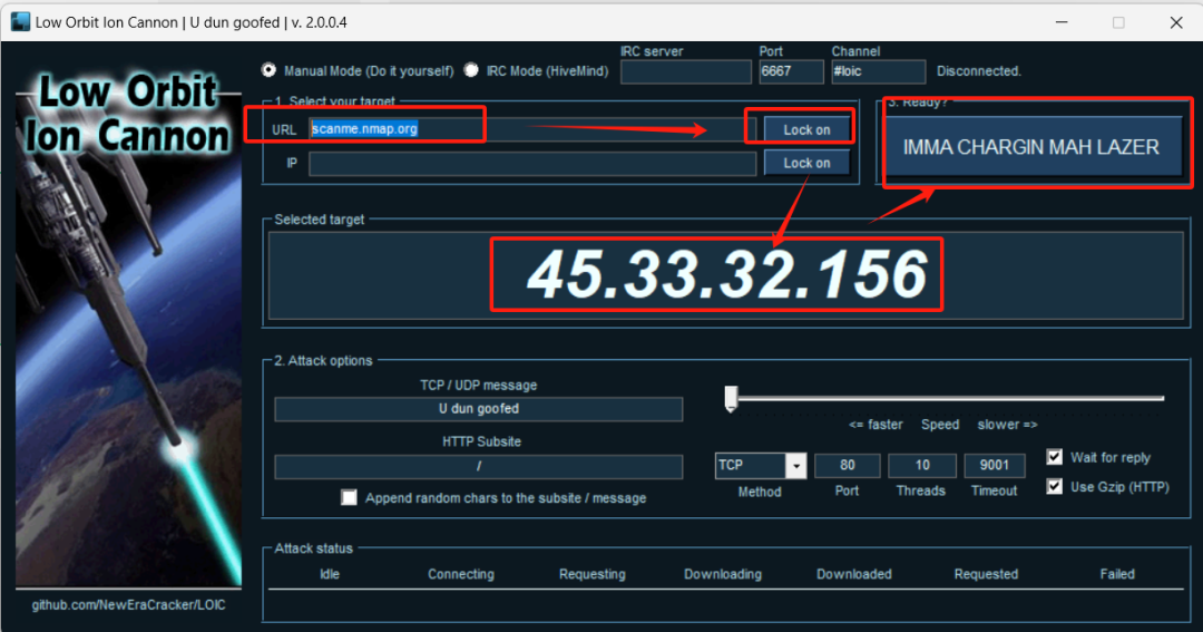 LOIC是一种网络压力测试工具,也被用于发动DDoS攻击。它通过向目标服务器发送大量数据包,耗尽其资源,导致服务不可用。简言之,就是利用众多计算机同时访问一个网站,使其过载崩溃。本文适合小白黑客,或立志学习网安的学员观看,仅做学习交流,切勿用于任何不法用途,否则后果自负!