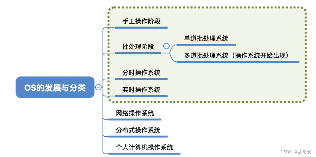 这篇文章,我们主要来讲述一下操作系统的发展与分类目录1.概述2.手工操作阶段 3.批处理阶段——单道批处理系统 4.批处理阶段——多道批处理系统4.1概念4.2 多道批处理系统提高效率的原因 5.分时操作系统 6.实时操作系统7.其他的一些操作系统8.小结首先,我们来看一下大体的框架图,掌握学习的路线:手工操作阶段是指计算机刚被发明的那个时候,那个时候是没有操作系统的。首先,一个程序员需要在打孔机