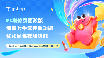 内置多实用组件(热区、图片魔方、图文导航、优惠券、限时秒杀、拼团等组件),支持颜色、边距、阴影等细节自定义,零基础也能快速搭建高颜值页面。Tigshop开源商城系统 JAVA v5.8.6正式上线,本次迭代围绕多项功能升级,重点覆盖新增pc自定义页面装修、属性模板优化和支持七牛云存储三大功能板块,旨在为大家提供更高效、更省心的商城使用体验,助力开源生态下的电商业务降本增效。支持属性、规格、附加服务