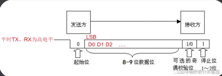 前置知识 波特率:每秒钟传递的bit的个数。 差分信号:使用两根线之间的电压差来表示高低电平。(传统的是用一根线相较于GND线(接地线)来表示高低电平) UART(串口)协议 UART 叫通用异步收发
