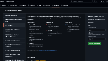 打开你的项目仓库页面(如在仓库主页,点击右上角的按钮,然后选择。LICENSELICENSE.md在文件名输入框输入LICENSE(全部大写),GitHub 会自动识别它是一个许可证文件。GitHub 提供了常见许可证的模板。在输入文件名后,你会看到一个按钮,点击它。在弹出窗口中选择。修改[year]为当前年份(如2024),[fullname]为你的名字或组织名(如Your Name或点击,填写
