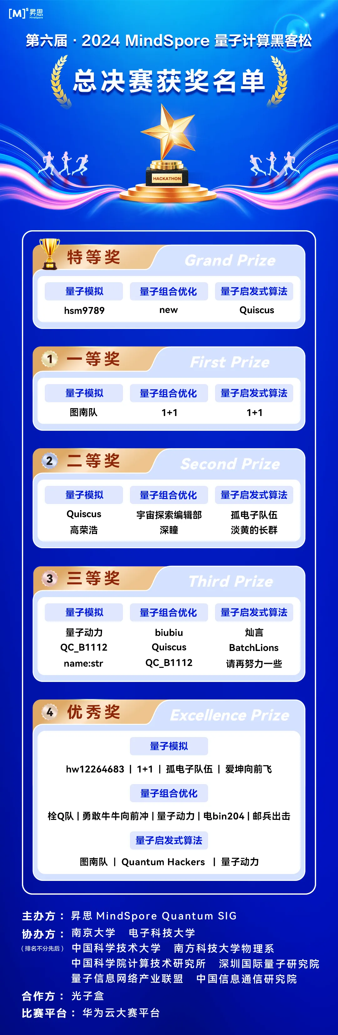 现在,备受期待的获奖名单已经揭晓,让我们向所有获奖者表示最热烈的祝贺,并期待他们在量子计算领域继续引领潮流,开拓创新!第六届 · 2024 MindSpore 量子计算黑客松全国总决赛。经过四个多月的激烈角逐,