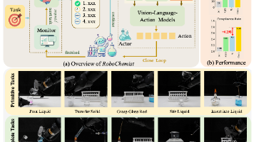25年9月来自BAAI、清华和新加坡南洋理工的论文“RoboChemist: Long-Horizon and Safety-Compliant Robotic Chemical Experimentation”。机器人化学家有望将人类专家从重复性工作中解放出来,并加速科学发现,但目前仍处于起步阶段。化学实验涉及对危险且易变形物质进行长时间的操作,成功不仅需要完成任务,还需要严格遵守实验规范。为了