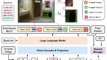 而 O3 是在看图的过程中就对图进行思考,在思考过程中,会有 Tool_Call 的过程。之前的一篇自动驾驶的结合了 Tool Call 的论文,调用的工具不仅仅只有图像放大,还有目标检测等等。上图是论文的一个示例,展示他们是如何把 Tool Call 加入到思维链中,从而形成对图的动态思考的。那么此时的状态就定义为所有的文本的裁剪的图片。论文对于这个任务中的状态(强化学习的那个状态)设置为:文本