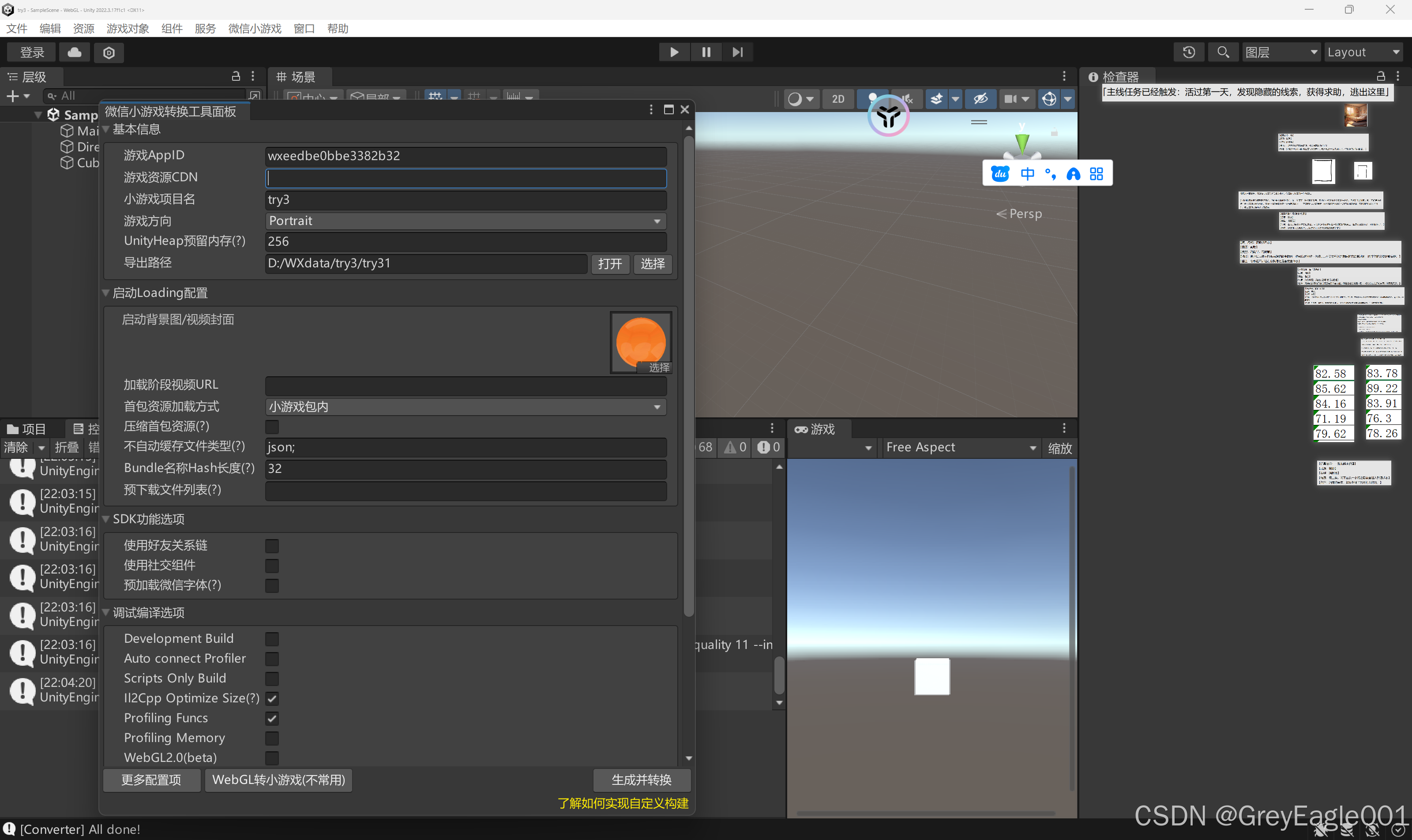 因此原始代码包(webgl/Build目录下的code文件)不超过30MB, 建议开发者勾选"Strip Engine Code"并设置"Managed Stripping Level"为High。同时,可以使用代码分包工具将代码包减少到原始尺寸的到1/3。初始场景中需要后续主场景或配置加载时可采取分帧策略,避免在Start或Awake方法中执行长时间的操作或阻塞调用,因为这会延长首帧的执行时间,