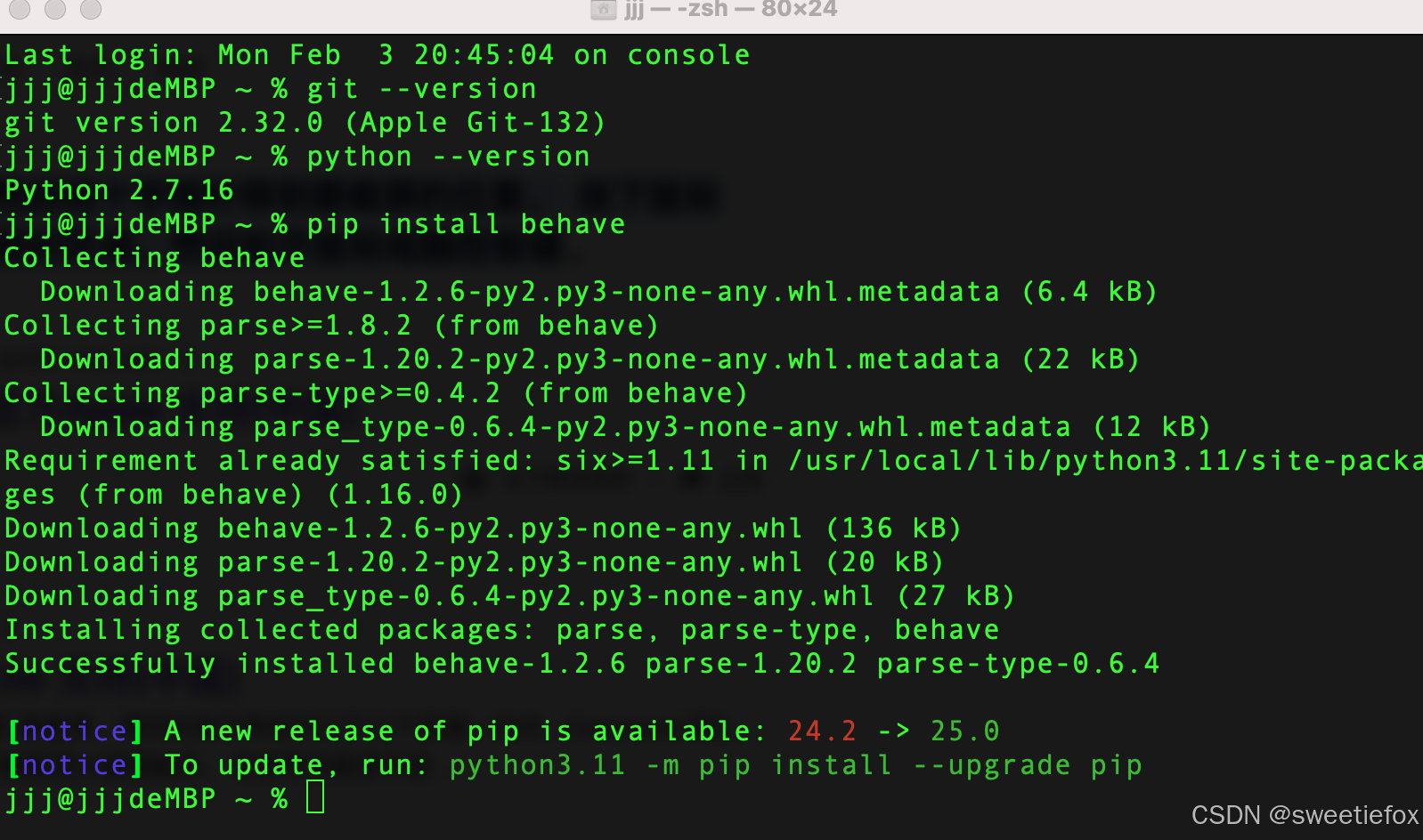 behave是自动化测试工具里面的一个框架,本文讲诉如何下载安装behave 以及在vscode里面添加behave插件来使用。在macos下命令行就很方便安装behave ,必须已经安装python。