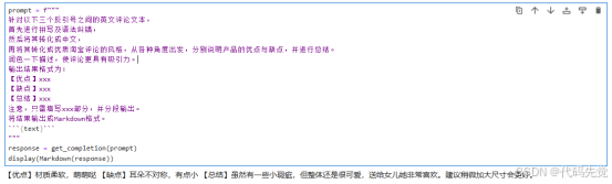 选择恰当的语言风格,让内容更容易被特定受众群体所接受和理解,是技巧娴熟的写作者必备的能力。在写作中,语言语气的选择与受众对象息息相关。prompt = f"""请校对并更正以下文本,注意纠正文本保持原始语种,无需输出原始文本。再将其转化成优质淘宝评论的风格,从各种角度出发,分别说明产品的优点与缺点,并进行总结。prompt = f"校对并更正以下商品评论:```{text}```"```小老弟,我