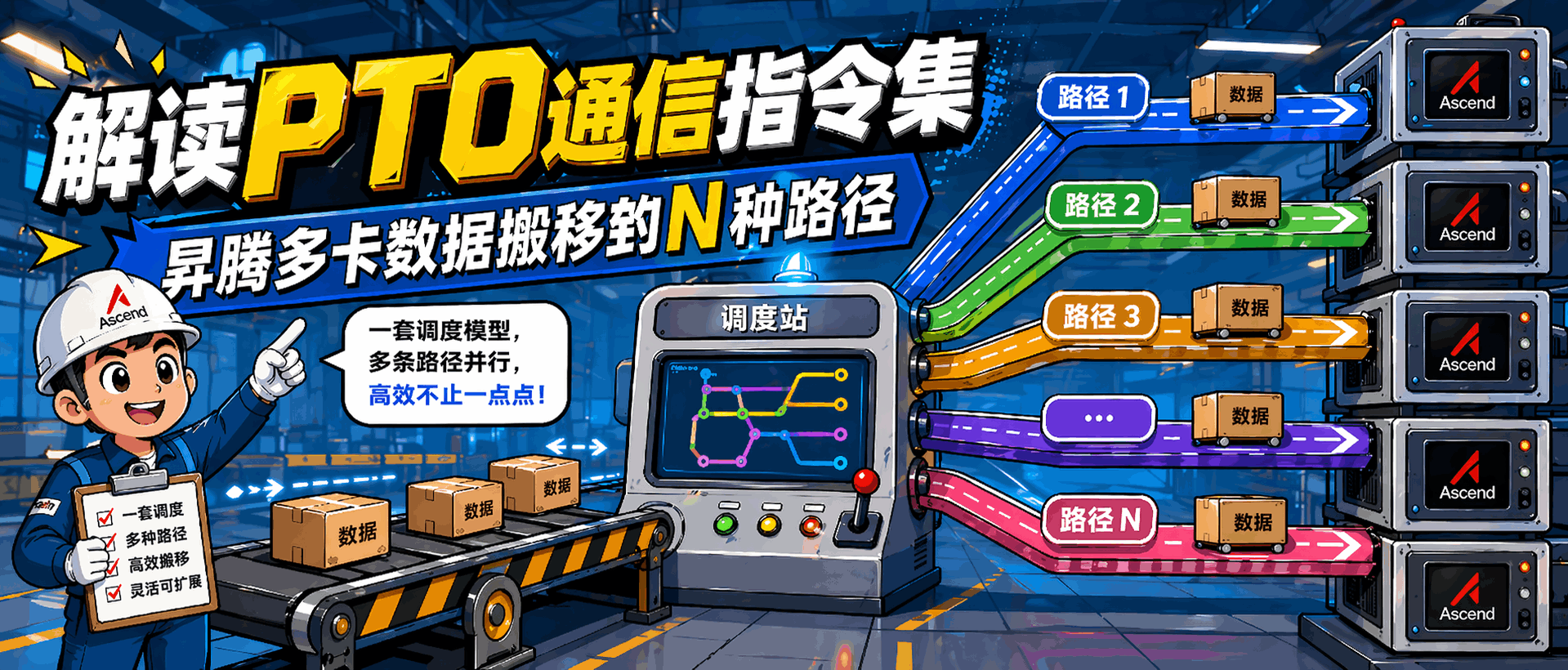 在PTO的设计里面,AIV 通过 TPUT_AYSNC 指令,把搬运任务转换成向 SDMA 硬件提交的传输描述符——相当于你把包裹和地址填好,交给快递员,然后回去继续工作。),如果是极小块的数据和较短的传输距离,可能还不如你自己送得快。CCU 是950代际新增的集合通信处理器单元,更像一个专门的分拣中心,你把货扔过去,它在内部完成归拢和分发。从此,计算与通信不再是割裂的两个孤岛,而是统一编程模型下