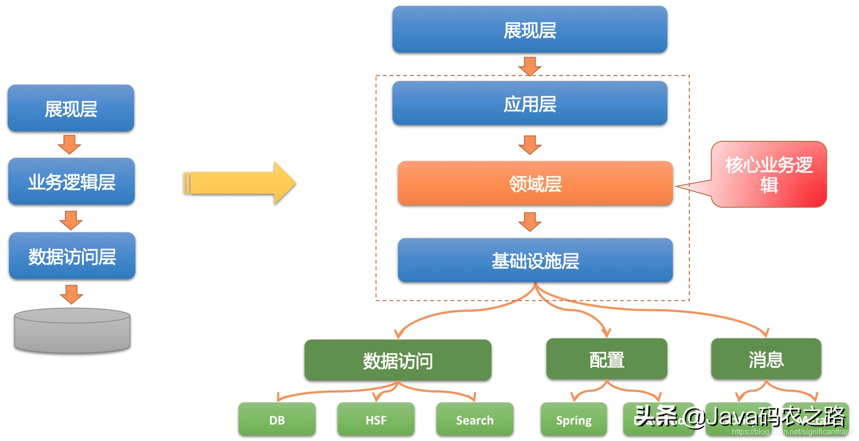 DDD:指领域驱动设计,是domain driven design的缩写。介绍DDD基础知识的相关文章很多,本文就不普及相关的基础知识了,基础理论知识可参考如下文章:《DDD基础知识与总结》《DDD与分层架构》1. 初识DDD脚本式编程(dao+service)与DDD领域驱动模式区别如下:其每一层的作用范围和含义如下:1)展现层(Presentation Layer):负责以Restful的格式