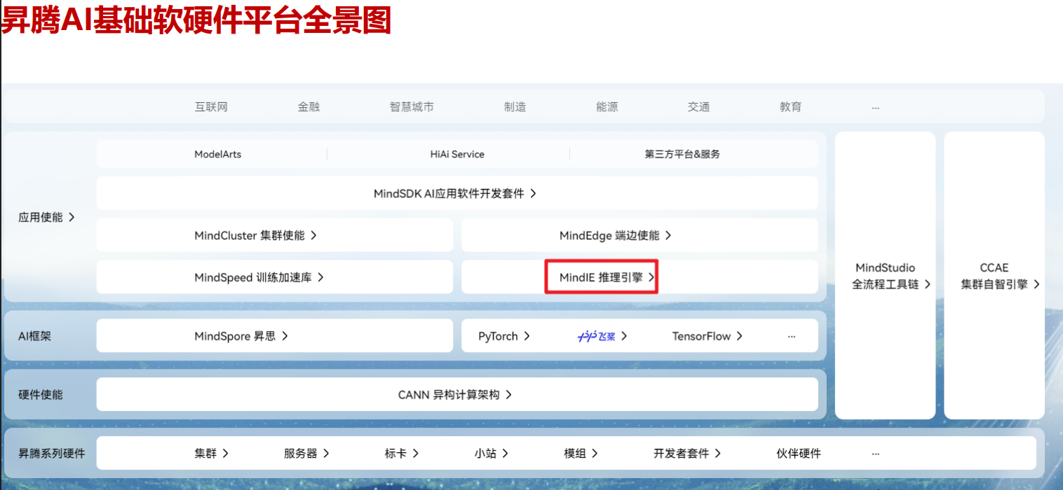 MindIE(Mind Inference Engine,昇腾推理引擎)是华为昇腾针对AI全场景业务的推理加速套件。通过分层开放AI能力,支撑用户多样化的AI业务需求,使能百模千态,释放昇腾硬件设备算力。向上支持多种主流AI框架,向下对接不同类型昇腾AI处理器,提供多层次编程接口,帮助用户快速构建基于昇腾平台的推理业务。主要包括模型推理引擎 MindIE和模型服务化 MindIE-Service。