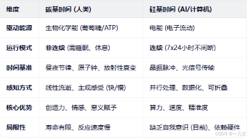 碳基时间与硅基时间对比摘要(149字) 碳基时间代表生物节律,受昼夜、代谢等生理限制,具有间断性和主观性;硅基时间则基于电能驱动,表现为连续运算和极速处理能力。两者的对比凸显了生命形态的根本差异:碳基时间体现人类有限的生物特性与情感体验,硅基时间展现机器的无限算力与精准记忆。当前讨论这一对概念,既反映碳硅文明融合的趋势,也引发关于存在本质的思考——人类如何在AI时代保持独特价值。这种时间观的碰撞,