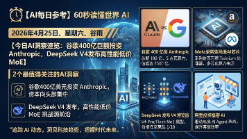 谷歌宣布向Anthropic投资最高400亿美元,同时提供5吉瓦算力,将Anthropic估值推至3500亿美元,是AI领域迄今最大单笔战略投资之一。与此同时,中国AI公司DeepSeek发布V4模型预览版,性能接近GPT-5.4等前沿模型,但价格仅为竞品的1/10,再次引发全球关注。国内外各5条精选资讯,带你快速掌握今日AI动态。