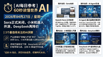 一是产品层面的"收缩与开放"并行——OpenAI 关掉了 Sora,小米把机器人训练全流程开源;二是成本层面继续下探——DeepSeek API 缓存价格再降九成,Cohere 与欧洲 AI 公司合并押注"主权 AI"赛道。国内外各5条精选资讯,带你快速掌握今日 AI 动态。