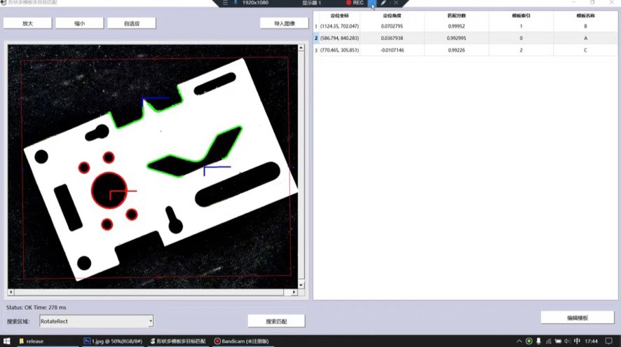 C++ OpenCV模板匹配框架源码,包括有方向矩形ROI、圆形ROI、环形ROI创建模板,画笔可以对模板区域涂抹实现屏蔽或选取,c++ opencv开发的基于形状多模板多目标的模板匹配源码,可实现定位,计数,分类等等,定位精度可达亚像素级别,运行速度采用并行加速。最后吐槽下OpenCV的matchTemplate函数,居然不支持旋转和缩放模板的匹配,害得要自己实现这些功能。比较实用的功能是模板库