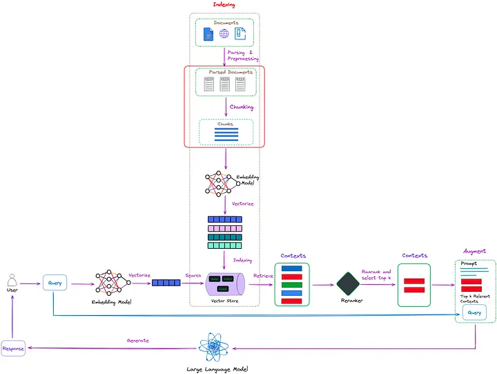 但是,如果在这些小数据块(small chunks)中找不到完整的信息,递归检索器(recursive retriever)会将相关的大数据块(larger chunks)传递到生成阶段(generation stage)进一步处理,就像我们在书中某个小节或段落查找资料时,如果需要更多信息,就会翻到相关的章节或整本书一样。通过 Semantic chunking(译者注:一种根据文本中的语义信息将