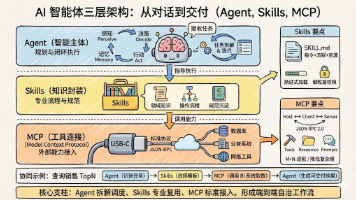 本文提出了一种三层智能体系统架构,使大模型从通用聊天工具升级为专业自治系统。架构包含:感知层(Agent负责任务拆解与RAG检索)、决策层(Skills封装领域知识与流程)、执行层(MCP标准化连接外部系统)。MCP作为统一接口协议,通过Tools/Resources/Prompts三种原语连接业务系统;Skills则将专家经验结构化,通过渐进式加载平衡性能与成本。该架构通过分层协作实现"