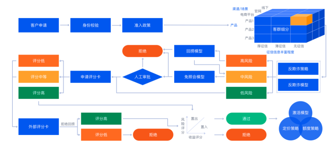 在银行实际信贷业务中,数据是分布在不同的数据库里,风控系统想要高效的利用数据,首先需要在数据层上,融合全量业务的数据,再在融合数据的基础上做抽取、清洗、预处理。这一层最关键是基于数据库的技术架构和数据架构,并结合风控体系业务功能需求,建立数据治理体系,实现数据采集、数据校验、数据清洗、数据存储、标准输出、数据监控闭环管理,支持多种不同类型任务和临时查询,保证数据规范存储和顺畅流转,满足SQL查询、