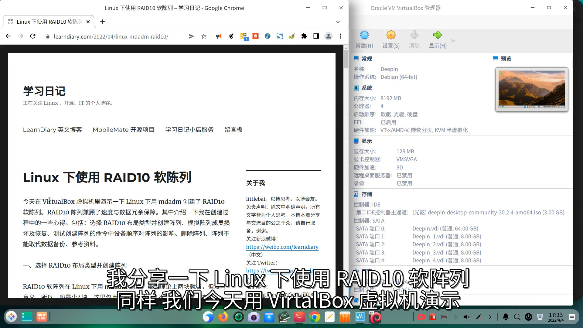 我在前面一则日记中在 VirtualBox Deepin Linux 虚拟机里演示一下用 mdadm 创建 RAID10 软陈列。今天补充一些我觉得在使用 RAID10 软阵列时值得注意的事项。包括:磁盘分区、阵列成员大小、添加阵列成员命令 --add 和 --re-add 区别及添加阵列成员顺序。测试的环境是 VirtualBox 里面的 Deepin 20.5 Linux,内核版本 5.10.
