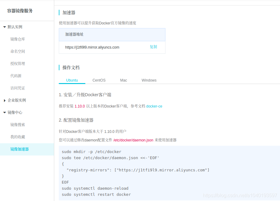 完成以后,点击左下的镜像加速器,选择对应的操作系统,然后将配置指令在终端依次执行完成即可。