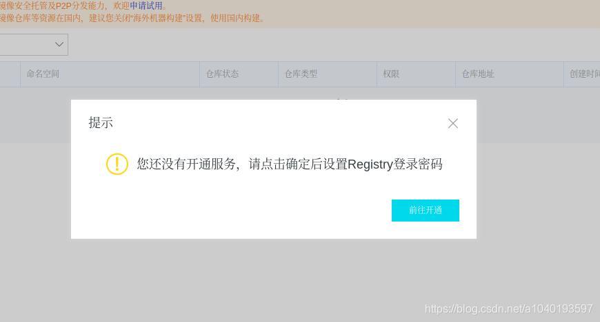 登陆阿里云–>搜索容器镜像服务 -->如果你第一次使用会弹出如下界面让开通服务,按操作开通即可。